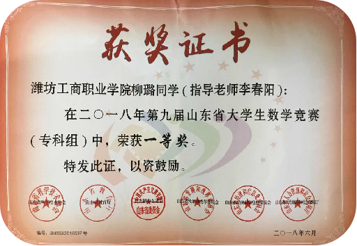 近日,由山东外贸职业学院承办的第九届山东省大学生数学竞赛圆满落下帷幕,我院建筑工程系15级工程造价三班柳璐在第九届山东省大学生数学竞赛(专科组)中荣获一等奖。
