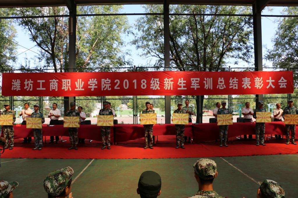9月7日,潍坊工商职业学院2018级军训总结表彰大会在学院风雨球场顺利召开 ,大会现场选拨出26个优秀集体,对军训期间表现突出的400余人进行了表彰。院长王传旭、党委书记郑志松等学院领导出席会议,18级全体新生、辅导员和教官共3000余人参加此次军训汇报演出。大会由党委副书记、副院长刘国庆主持。
