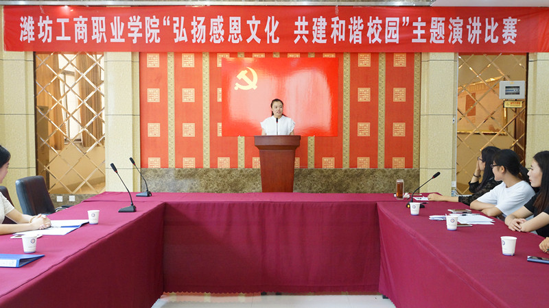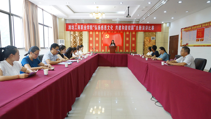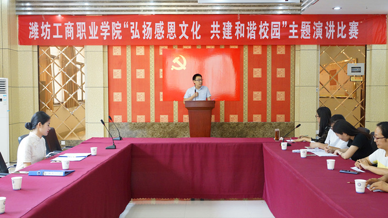 为进一步加强我院教职工思想道德建设,构建感恩文化长效机制,根据学院制定了《潍坊工商职业学院关于开展“弘扬感恩文化•共建和谐校园”活动的通知》【潍工职院发〔2018〕15号文】的精神,6月22日下午,学院在交流中心219会议室举办了“弘扬感恩文化 共建和谐校园”主题演讲比赛。