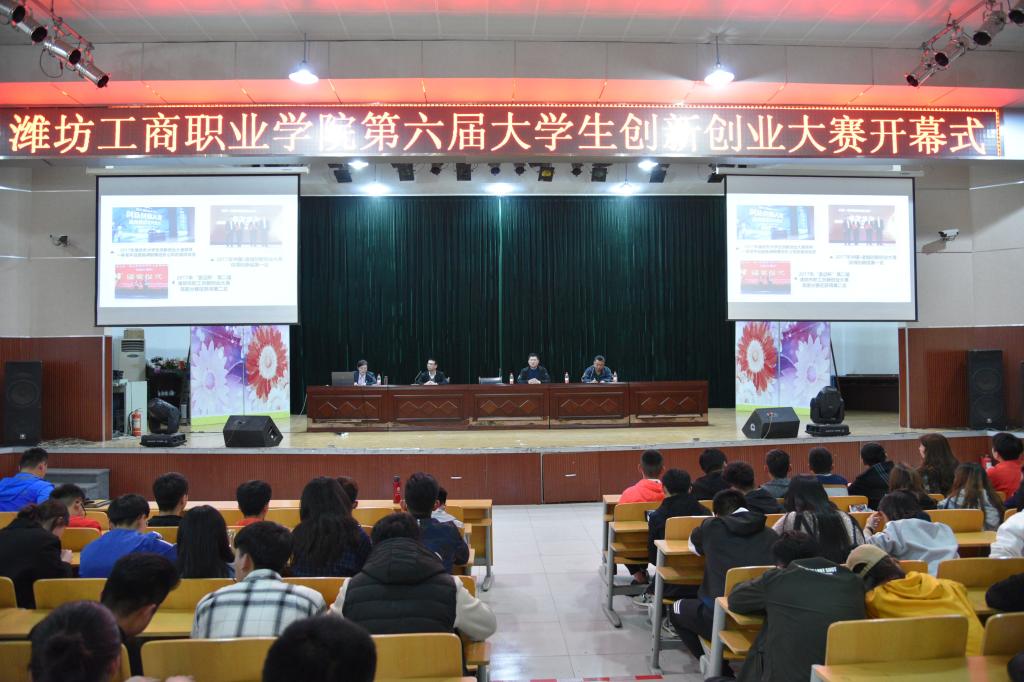 潍坊工商职业学院第六届大学生创新创业大赛开幕式于3月28日下午在学院第一报告厅隆重举行。我院学生会、社团联合会骨干,创业者协会成员,各班班长及团支部书记以及具有创新创业意向的同学共计300人参加了开幕式。开幕式由学生处处长陈锋主持。