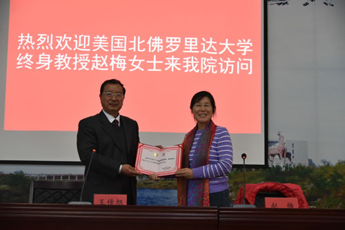 2017年12月18日,美国北佛罗里达大学终身教授赵梅女士受邀来到潍坊工商职业学院,在学院第二报告厅,为学院教师代表们做主题报告。学院院长王传旭、党委书记郑志松等学院领导和教职工代表参会,王传旭院长主持会议。