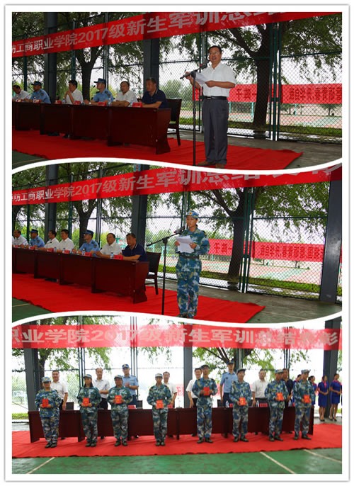 院长王传旭在大会上首先对教官们和老师们的辛勤付出表达了衷心的谢意和问候,对同学们顺利的完成军训任务表示肯定,希望新生们在以后的学习生活中,发扬军训吃苦耐劳、勇于拼搏、坚持不懈的精神,积极热情的投入到新的学习生活当中,做一名合格的大学生。