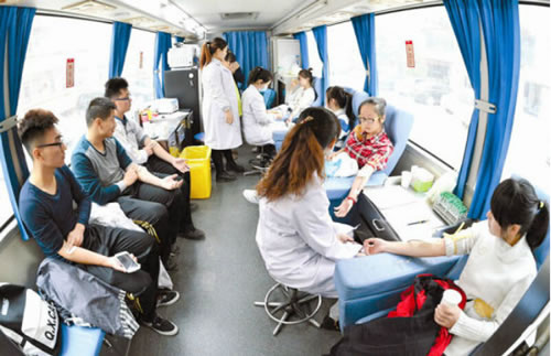 11月18日清晨7点30分,献血车缓缓开进校园,停在了图书信息楼西边的大路上,社团联合会的无偿献血志愿者们帮助医护人员有序的进行献血前所需器械、纪念物品、通电等一系列准备工作。细雨朦朦,寒气袭人,这几天突来的寒流让同学们都裹上了厚厚的衣装,但是大学生们无偿献血的爱心却温暖了大学校园。活动开始不久,献血车就引起了很多同学的关注,献血车周围人头攒动,在无偿献血志愿服务者的引导下,自觉地排起了长队,秩序井然,符合条件的同学积极填写献血登记表。今天第一位参加献血的同学叫成瑾,她是第一次参加献血,献血之前她心情有些紧张,但是几番犹豫之后还是毅然走进了献血车,在接受大学生记者团成员采访时,生性腼腆的她表示很高兴能够参加这次的无偿献血活动。在社联理事长汤晓同学的带领下,爱心社的成员也积极参与到活动中,汤晓同学首先带头献血400毫升,为广大社团人树立了榜样,起到了模范带头作用。本次无偿献血活动中,记者团成员采访到了女生中献血量最多的张美玲同学,她这次献血献了400毫升,这已经是她第二次献血了,第一次献了300毫升,她表示,为了帮助更多的人,传递更多的爱心,今后会更加积极地参与到无偿献血活动中去。