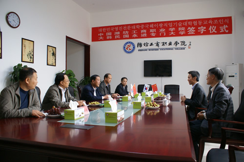 在会谈中,王立波院长指出,潍坊工商职业学院作为诸城市唯一一所高校,在注重服务地方经济社会发展、大力培养高素质技能型人才的同时,十分重视学院发展的国际化和学生发展的国际化,并将国际化作为学院和学生发展的重要增长点之一,目前已与多个国家和地区的高校及机构建立了友好合作关系;他进一步强调指出,中韩两国文化和生活习惯相近,这有助于加强双方的沟通和交流,两校合作潜力巨大,希望双方进一步增强合作与交流。崔俊教授代表永进专门大学表示,潍坊工商职业学院是一所办学质量高、管理严的高校,双方经过多次的沟通和交流,最终能够顺利来访并签署合作协议,必将对双方今后的合作奠定良好基础。