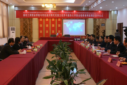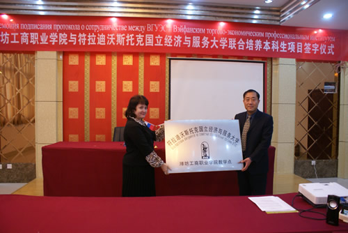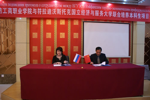 王立波院长首先向来宾致欢迎辞,并介绍了学院基本情况尤其是联合办学的状况。切尔娜娅·伊莉娜·彼德洛夫娜对符拉迪沃斯托克国立经济与服务大学的相关情况做了简要介绍。随后,双方共同观看了两校的专题片,并举行了合作签字仪式。双方就在我院设立符大联合培养本科生项目教学点、师生互换和访问、文化活动交流、研究和应用教学方法和科学技术、共同举办讲座和研讨会、短期的专业培训和再培训等事宜达成意向。