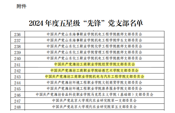 近日,潍坊市委教育工委发布《关于命名五星级“先锋”党支部的通报》中,我校经贸学院党支部、幼教艺术学院党支部、机电与汽车工程学院党支部三个支部被评为五星级“先锋”党支部,表彰其在党建引领、服务群众、创新实践等方面的突出成效,成为基层党组织的示范标杆。