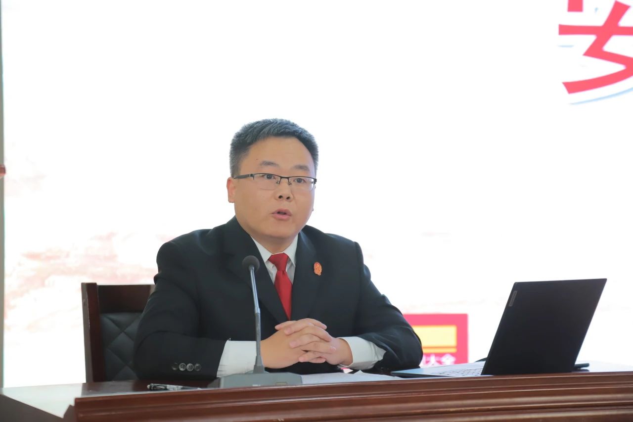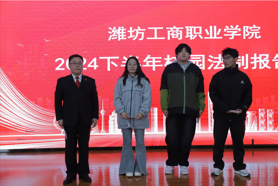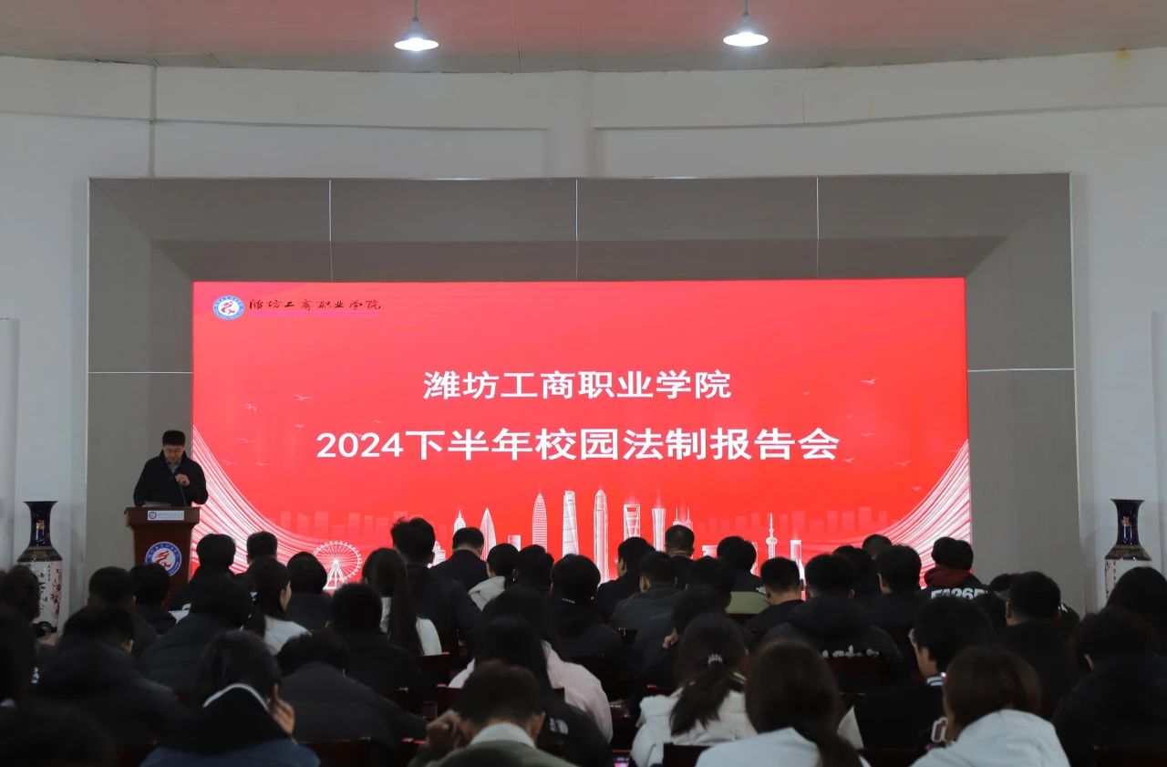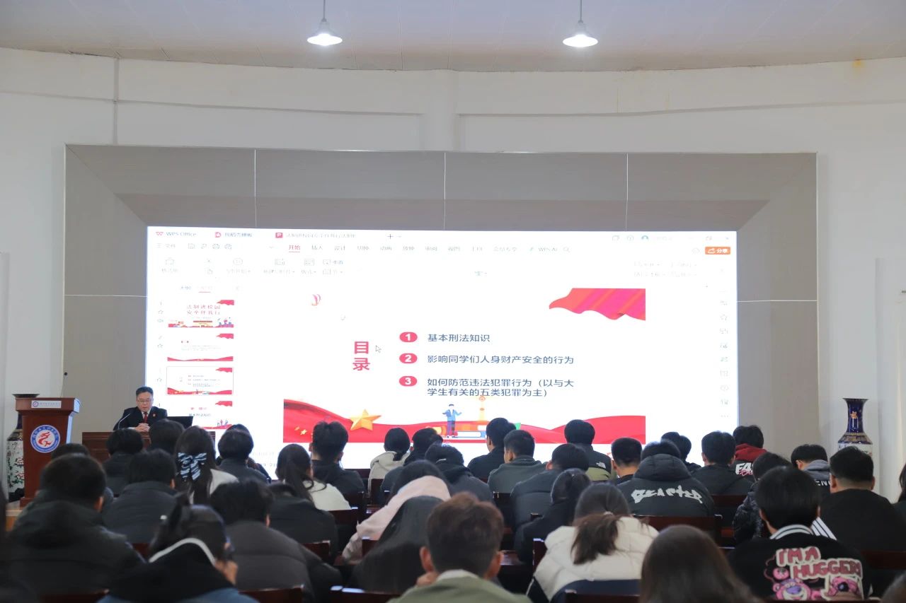 2024年11月4日,我校2024下半年校园法制报告会在第二报告厅成功举办。诸城市人民法院刑事审判庭庭长杨奎友、法官朱跃纬、我校党委副书记刘国庆、学生处、安保处负责同志以及部分辅导员和学生代表出席了会议。