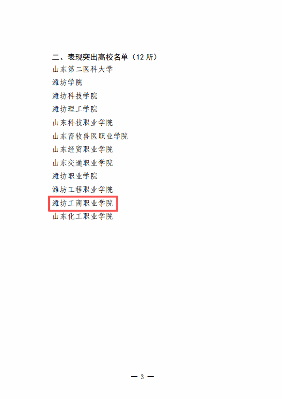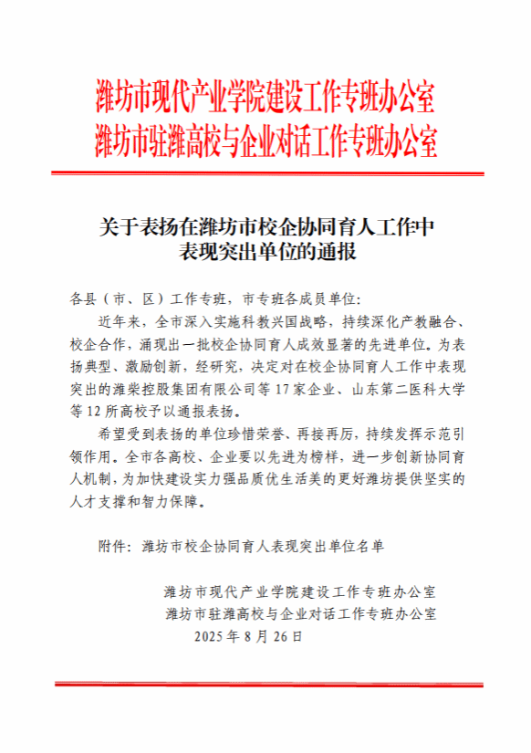 近日,潍坊市现代产业学院建设工作专班办公室与潍坊市驻潍高校与企业对话工作专班办公室联合发布《关于表扬在潍坊市校企协同育人工作中表现突出单位的通报》,对全市在校企协同育人方面成效显著的单位予以通报表扬。我校与山东第二医科大学等12所高校凭借多年来在校企合作、协同育人方面的扎实工作和创新成果,成功入选“表现突出高校名单”。