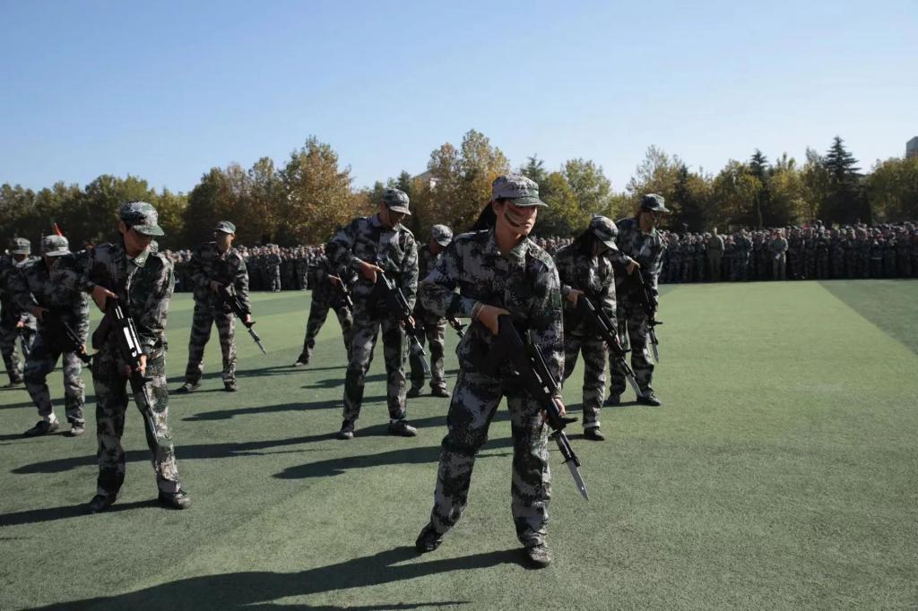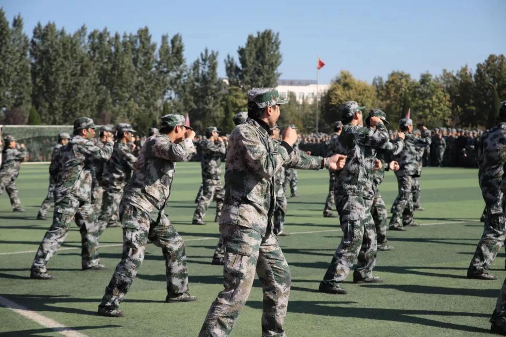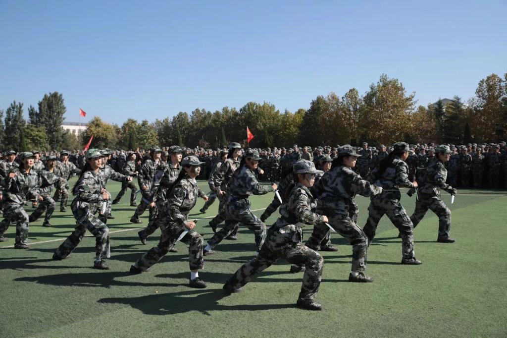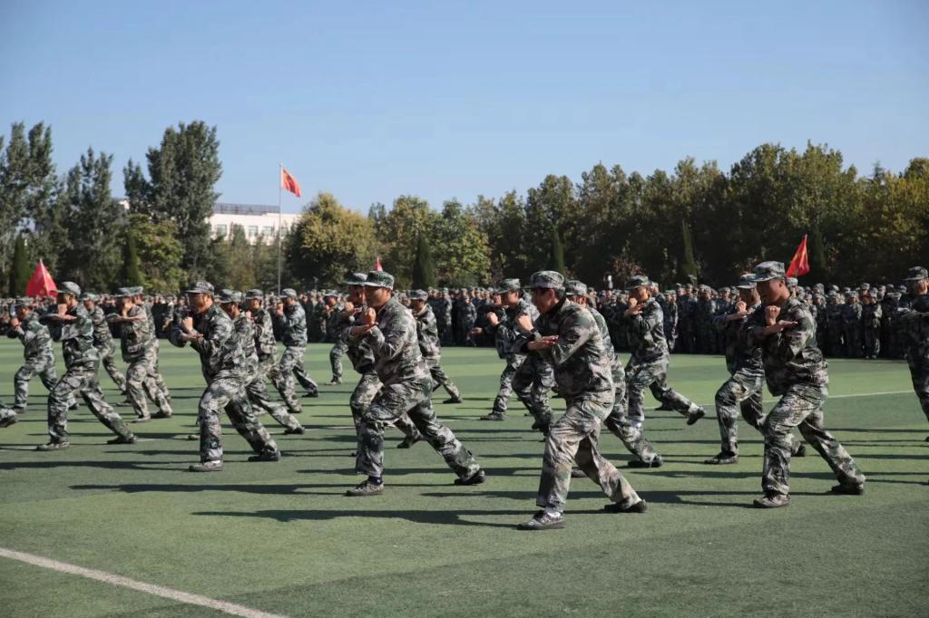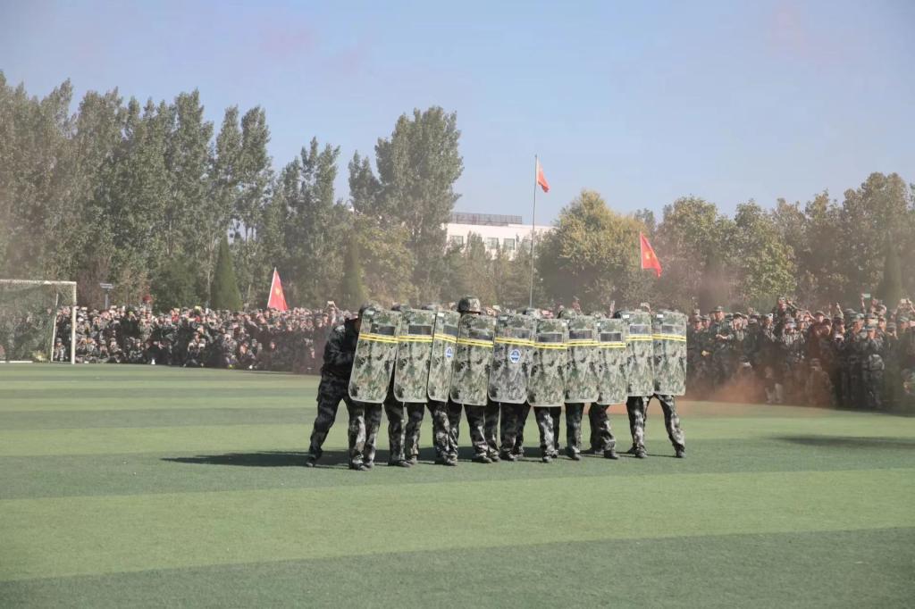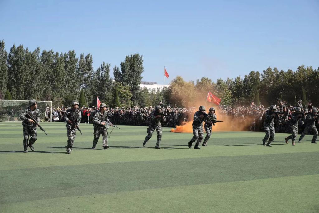 表彰大会上,刺杀操、女子军体拳、男子擒敌拳、战术对抗等军事科目表演动作整齐划一、刚健有力,展示了我校新生良好的形象和精神风貌。
