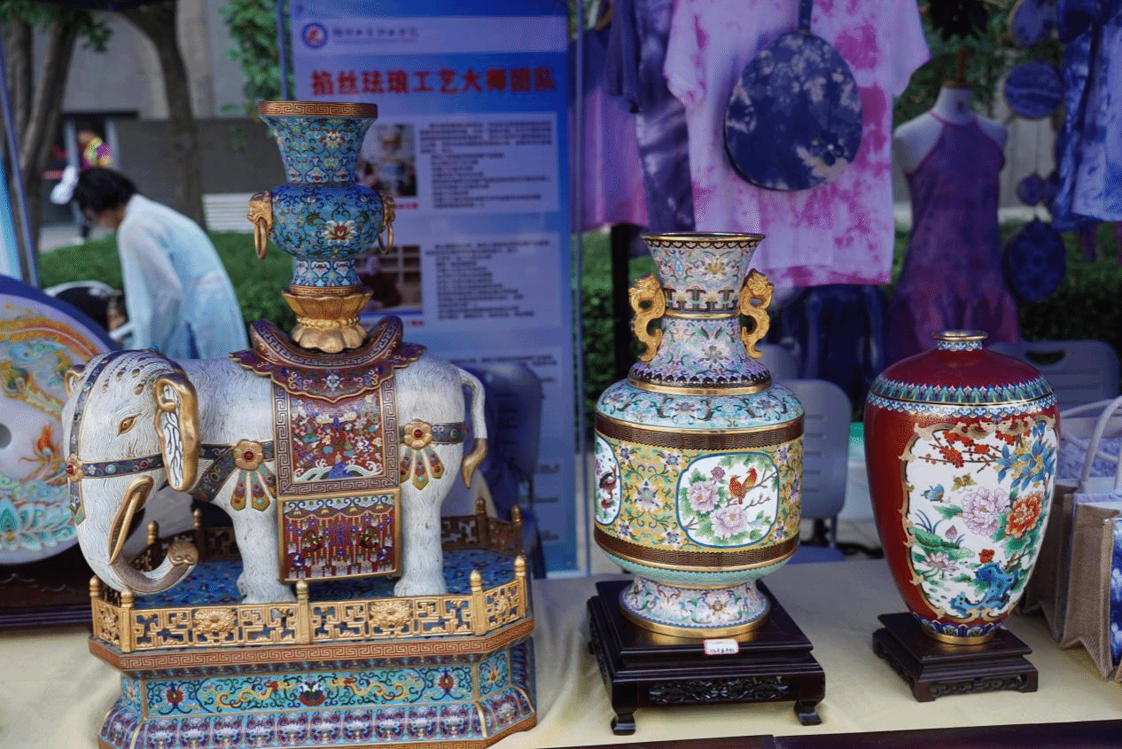 展览中,我校展出了掐丝珐琅作品《清明上河图》,其工艺精湛、气势恢宏,吸引众多观众驻足欣赏并拍照留念。服装与艺术设计专业师生利用废旧布料制作的扎染扇子、手帕等实用工艺品,既环保又富有传统文化韵味,备受好评。