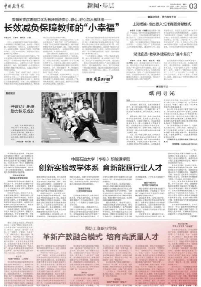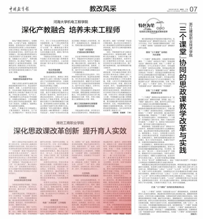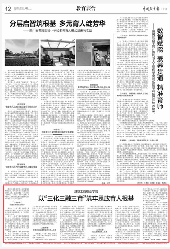 《中国教育报》今年三度专题报道潍坊工商职业学院办学创新成果。3月7日,第7版聚焦学校以“大思政课”建设为引领,通过“四变三率”教学模式与“五维融合”创新路径,推动思政课内涵式发展的经验;4月19日,第3版报道学校以“实体化、产权化、专业化”为核心策略,构建“集团化办学、校企利益共生”产教融合新模式的实践;10月17日,该报再次报道学校立足职业教育特点,历经五年探索,破解育人现实问题,构建起“三化培根、三融铸魂、三育成才”“大思政”育人体系的成果。