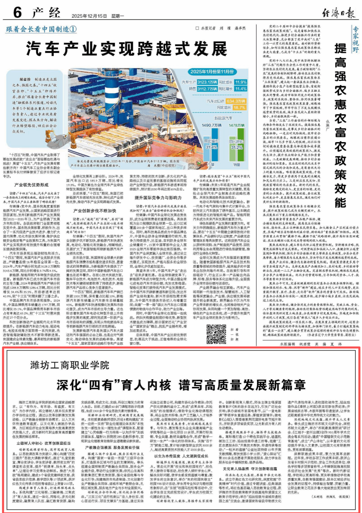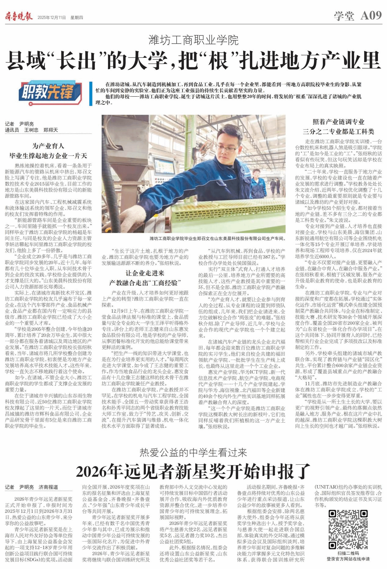12月11日,齐鲁晚报以《潍坊工商职业学院:县域“长出”的大学,把“根”扎进地方产业里》为题,专题报道了学校扎根县域、深度融入地方产业,通过产教融合培养高素质技术技能人才的办学实践与成效。