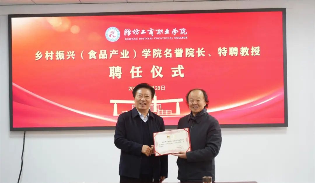 11月28日上午,我校举行名誉院长、特聘教授聘任仪式,聘请中国烹饪大师、山东省烹饪协会党支部书记、副会长许长麟为我校乡村振兴学院(食品产业)名誉院长、特聘教授。校长张绍秋,执行校长、党委常务副书记郑志松,乡村振兴学院执行院长玄兆强及食品专业骨干教师代表出席了聘任仪式。执行校长、党委常务副书记郑志松主持聘任仪式。