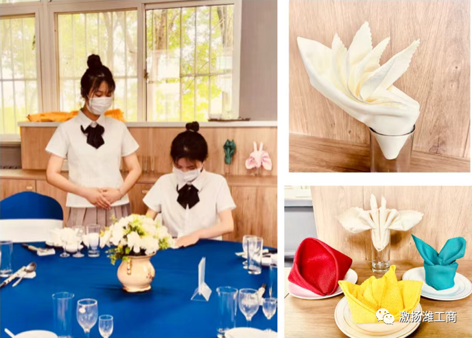 中餐宴会摆台是通过主题、布草、台面,通过构思和创新,彰显地方文化、酒店文化。选手们正在展示的是餐巾折花技能。通过艺术创造,将餐巾折成各种动植物形态,插摆在口杯、盘碟中供人们欣赏。同时也能通过花型来区分宾主位次。