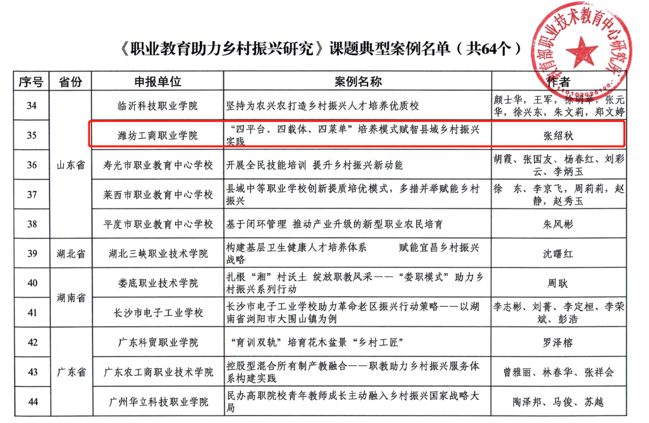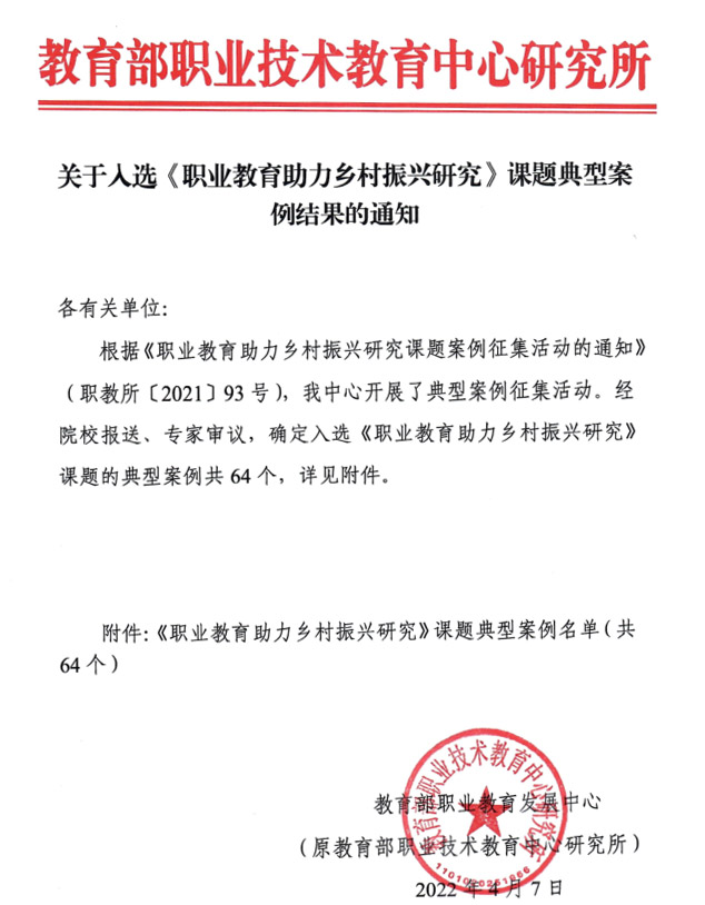 近日,教育部职业教育发展中心公布了入选《职业教育助力乡村振兴研究》课题典型案例名单,全国2000多个案例参评,仅有64个入选。我校申报的《四平台、四载体、四菜单”培养模式赋智县域乡村振兴的研究与实践》成功入选。本次案例入选是学校在职业教育助力区域乡村振兴探索中取得的又一重要标志性成果。