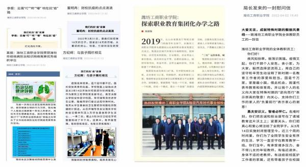 “我们的抗疫故事”系列文章在微信公众号连续推出,深受好评,影响广泛;抗“疫”故事系列文章真人真事,真情实感;坚守奉献,催人泪眼!局长来信:“你们不顾个人安危,舍小家,为大家,毅然选择逆流而上 ……危难时刻,你们把忠诚和担当谱写在了诸城教育这片沃土上;紧要关头,你们把真心和爱心倾注给了全院学子 ……”