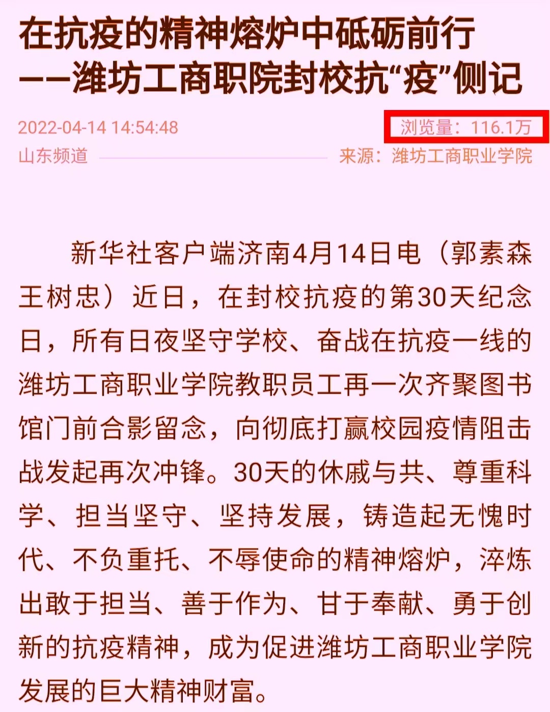 4月14日,新华社客户端转发我校公众号《在抗疫的精神熔炉中砥砺前行——潍坊工商职院封校抗“疫”侧记》一文,引发广泛关注。发布不到三个半小时,阅读量已超百万!当天下午,师生一起在微信群里动态报告着着阅读量的飙升,与百万读者共同见证学校的高光时刻。那是我们师生凝聚的精神力量,那是我们共同创造的荣光!