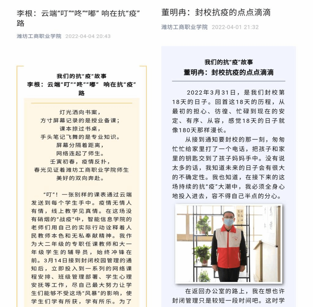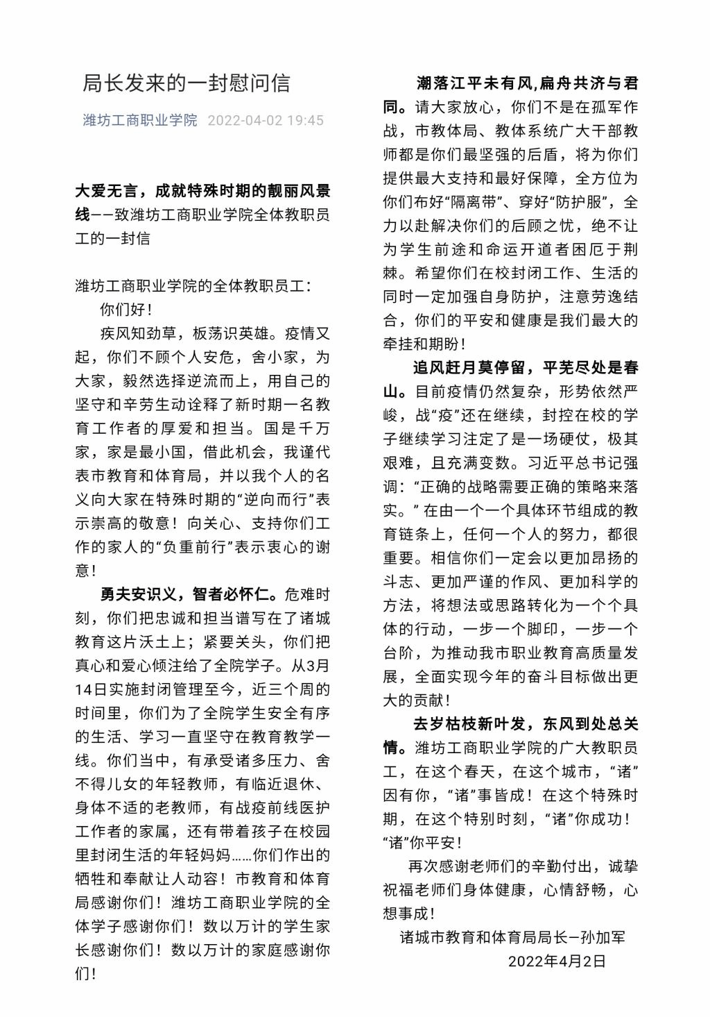 ——这一月,阶段性抗疫成果显著。学校深入落实上级疫情防控政策,开展疫情防控一级响应应急演练,明确职责、严格程序、执行到位,向驻地社区、诸城人民、潍坊人民交上了一份满意的答卷。4月2日,诸城市教体局孙加军局长亲笔写来慰问信——“你们不顾个人安危,舍小家,为大家,毅然选择逆流而上,用自己的坚守和辛劳生动诠释了新时期一名教育工作者的厚爱和担当”。