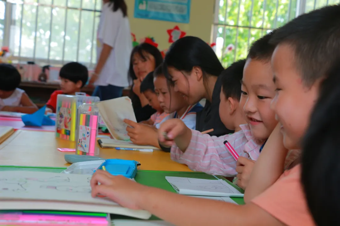志愿者们迎着烈日骄阳,步行半小时来到希望小学,为孩子们送上知识和自己制作的小礼物,让安静的校园充满着欢声笑语。志愿者经过与社团指导教师半个多月的磨课,教学能力和水平得到快速提升,在授课过程中各展才艺,为孩子们奉献了一堂精彩有趣的艺术课。他们与小朋友一起唱歌、跳舞,和小朋友一起绘制有趣的图画,为孩子们送上知识和快乐。