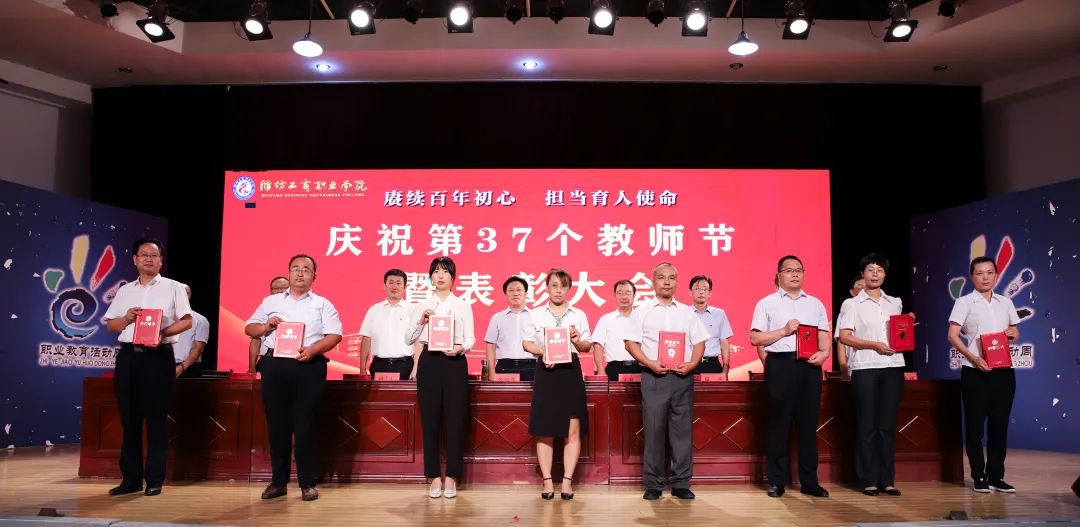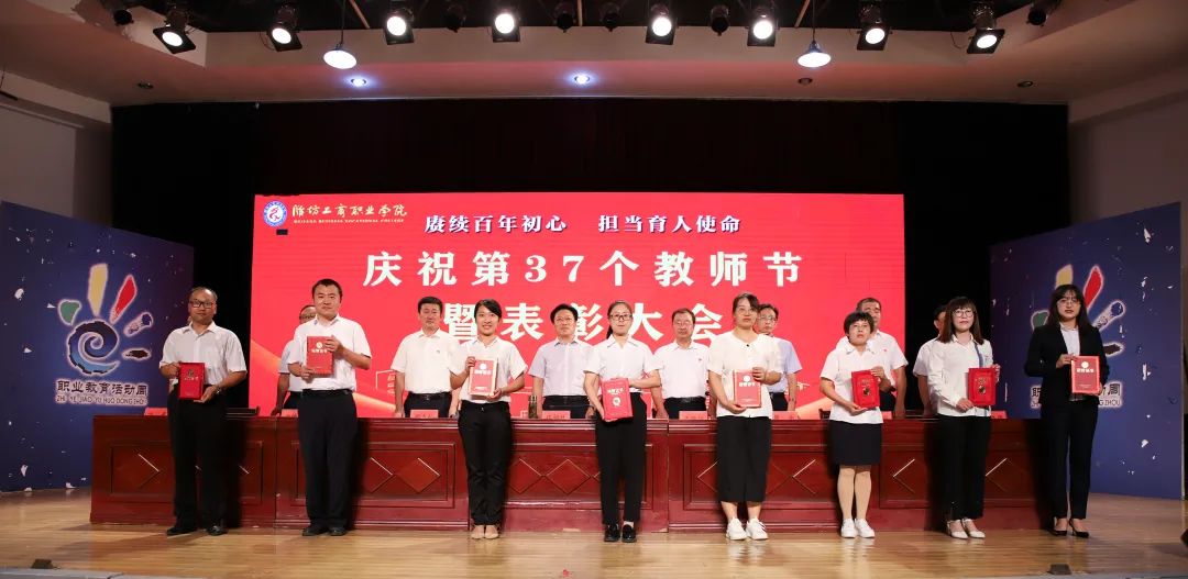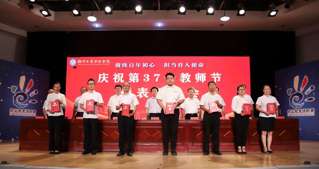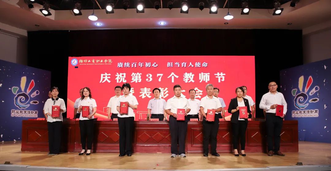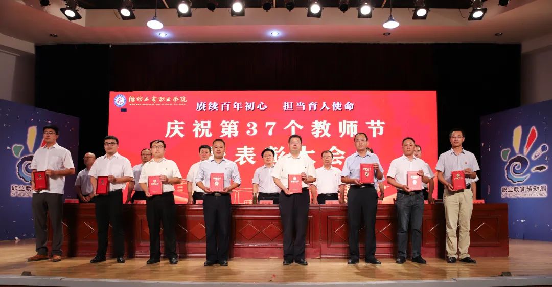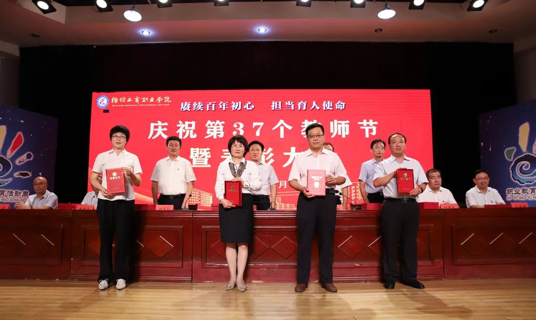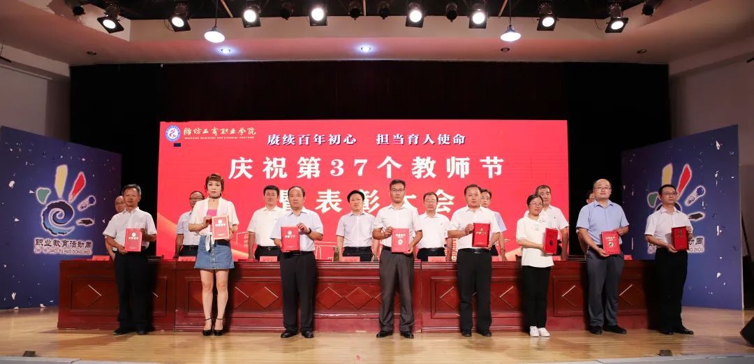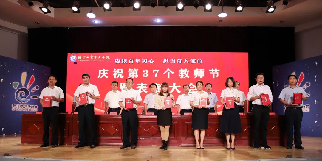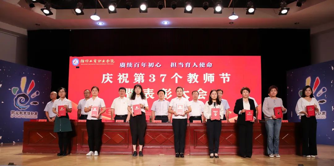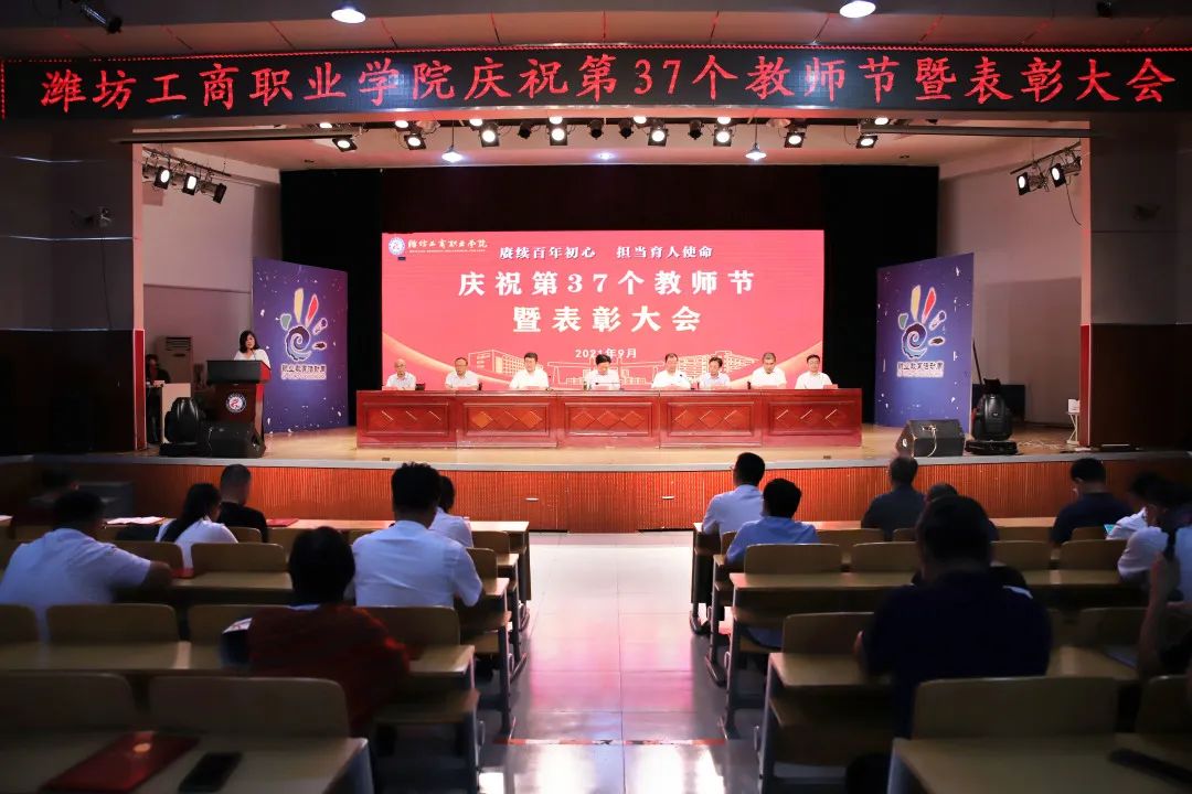 十年桃李硕果丰,九月颂歌感师恩!9月9日,为庆祝第37个教师节,潍坊工商职业学院在第一报告厅隆重举行教师节表彰大会,本次大会的主题是“赓续百年初心,担当育人使命”。潍坊工商职业学院校委会主任张绍秋、校长王传旭、党委书记郑志松等学校领导和教师代表出席本次大会。大会由校长王传旭主持。