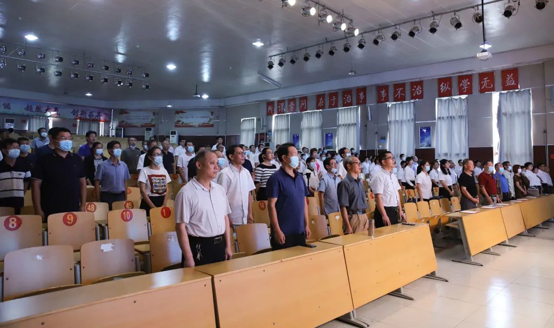 大会第一项奏唱国歌,学校首先向退休老教师献上鲜花以表彰他们几十年如一日,牢固育人初心,担当育人使命,为教育事业无私奉献的精神。