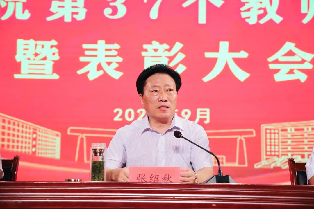 校委会主任张绍秋做总结发言。他首先代表学校校委会,向辛勤耕耘在教育教学一线的广大教师和全体教育工作者表示亲切的问候和崇高的敬意!他表示百年大计,教育为本;教育大计,教师为本。选择了教师,也就选择了艰辛和奉献。学校一天天正在走着上坡路,我们各项工作已取得了实实在在的成绩和进步。值此教师节之际,张主任向全体教师提出两点希望:一是身为一名老师一定要有大爱精神。教师既要有学术,更要爱学生。工作中对学生要有真心、有责任心、有耐心,关爱学生、愿意为学生、为教育事业奉献自己的智慧和激情。二是教师要有大师的追求。我们要从师德上不断完善自己,要从学术上不断提升自己,要从教学上不断优化自己,认真履行自己作为一名人民教师的神圣使命和光荣职责,注重培育学生的创新精神和实践能力,切实引导学生成长成才、全面发展,努力培养适应社会主义现代化建设需要的一代新人。
