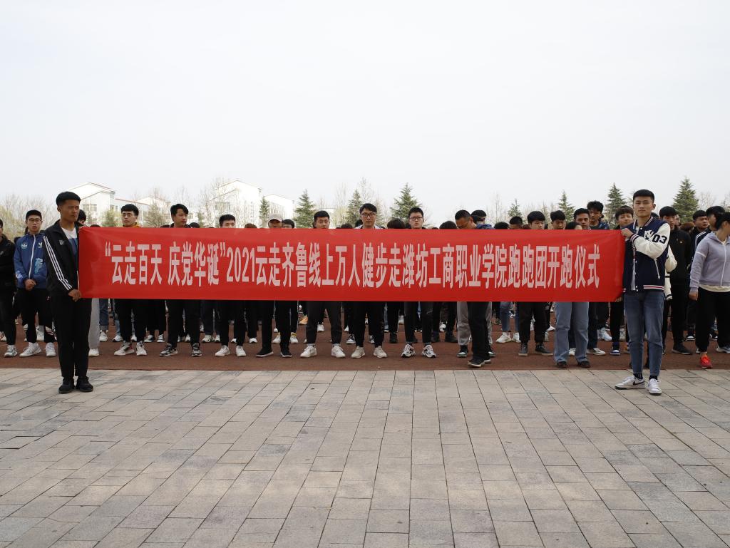 潍坊工商职业学院积极相应山东省体育局倡议开展的“云走百天 庆党华诞” 2021云走齐鲁线上万人健步走活动,由工会、机电汽车工程学院和学生处发动,学院成立了“潍坊工商职业学院跑跑团”,广大师生踊跃报名,形成了2075人的团队,在全省各健步走团队中名列第35名。3月24日下午4点,风和日丽,潍坊工商职业学院跑跑团在学院体育场举办了“潍坊工商职业学院跑跑团”开跑仪式,学院王传旭校长发表了热情洋溢的开跑讲话。