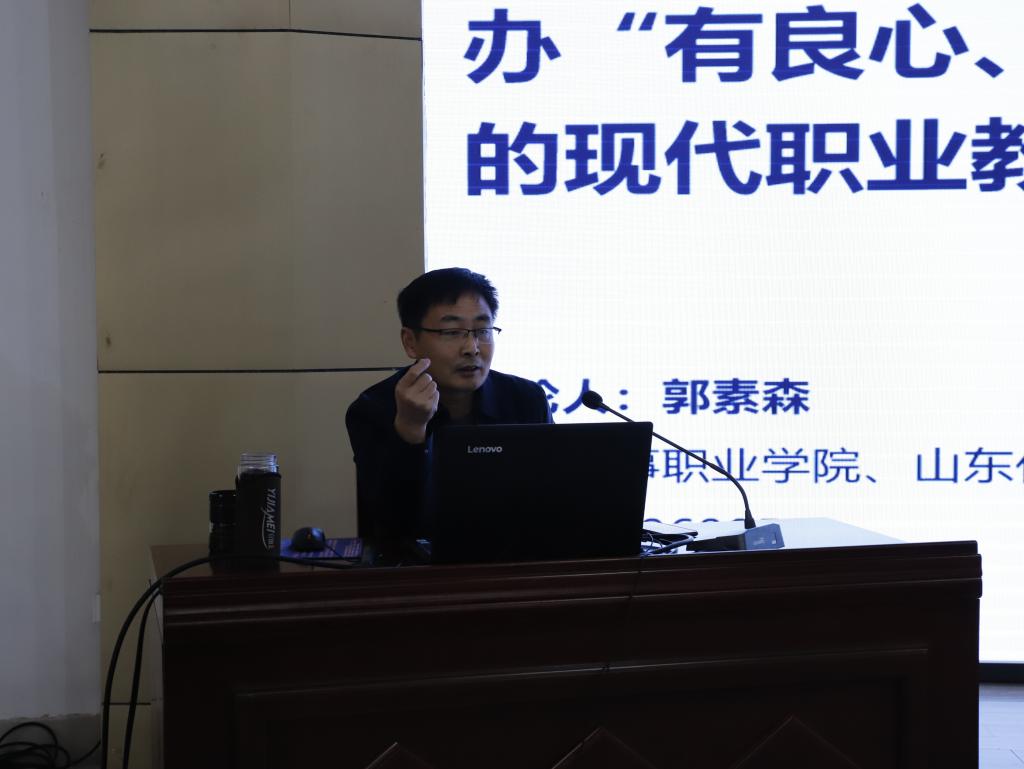 培训班最后一场报告,是由山东海事职业学院、山东化工职业学院研究室主任郭素森教授做的《办“有良心、有生命、有市场”的现代职业教育》的报告。郭教授从哲学和伦理道德纬度,过程和成长的维度,经济和社会维度三个方面,通过现实案例生动阐述了在现代职业教育办学过程中的核心和重点问题,就如何办“有良心、有生命、有市场”的现代职业教育提出了自己独到的意见和见解。