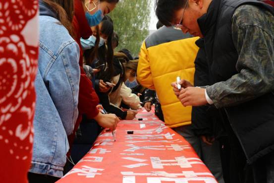 12月1日世界艾滋病日活动当天,青春同伴社指导老师宋杰在图书信息楼西侧广场进行了“携手防疫抗艾 共担社会责任”主题宣讲,社团联合会和青春同伴社准备了印有“携手防疫抗艾 共担社会责任”今年世界艾滋病日宣传主题口号的横幅,让同学们进行签名仪式,让自己的名字记录在防疫抗艾的口号中,本次签名仪式人数超出预期,前来签字的同学很多很多,横幅上短短几分钟就签满了名字,