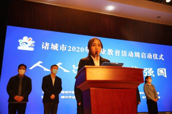 潍坊工商职业学院2020级新生代表冯晓宇发言。她表示自己在学院大家庭里,懂得了文化理论学习与专业技能并重的重要性,并与同学们共勉,作为新时代的职业院校大学生,要以本次职业教育活动周为契机,不忘初心,紧跟时代,不负韶华,创造自己的出彩人生。