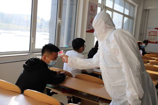 辅导员赶赴现场进行体温诊断,发现该学生体温超过37.3℃,并伴有其他疑似症状,辅导员将疑似学生转移到临时留观点安抚并立即上报学校疫情防控领导小组,迅速启动应急处置流程。