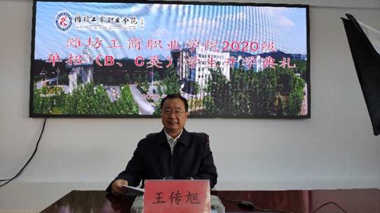 潍坊工商职业学院校长王传旭致辞。王校长首先详细地给同学们介绍了我校的办学历史、师资力量、教学设施及专业特色,并向同学们提出了美好的希望,希望广大新生树立远大的理想,了解大学的学习管理规定及实施过程。学会把读书、思考、实践有效结合起来的同时,做到从被动学习到主动学习、研究性学习的转变,从而提高自身综合素质和就业竞争力。