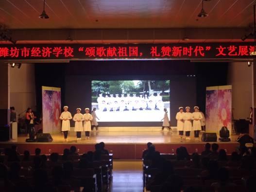 9月29日,潍坊市经济学校在第一报告厅举行庆祝新中国成立71周年文艺展演,学校领导、教师及全体在校学生参加了活动。校领导代表学校在比赛开始之前发表了热情洋溢的致辞,全体师生起立,共唱中华人民共和国国歌。在激扬的国歌声中,拉开了文艺展演的序幕,各展演节目争奇斗艳,舞蹈、合唱、相声、专业礼仪表演,各放异彩,现场高潮一波接一波。