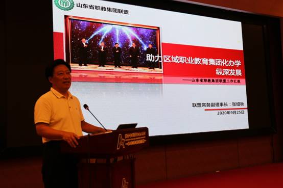 山东省职业教育集团联盟常务副理事长、我校校委会主任张绍秋作工作报告。张主任以助力区域职业教育集团化办学纵深发展为题,在联盟工作报告中向与会嘉宾、领导和全省职教同仁详细介绍了省职教集团联盟成立三年以来所做的工作、取得的成效、积累的工作经验和工作思路等,并就职教集团实体化运作提出了下一步工作目标,为职教集团联盟今后发展指明了方向。