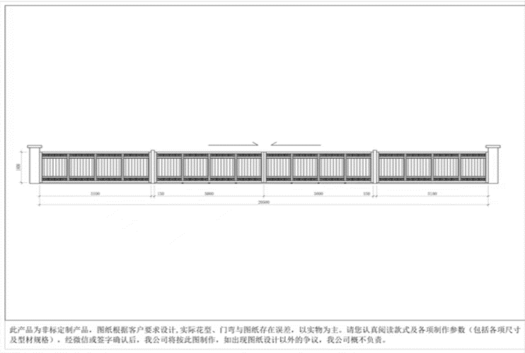 西门口两侧砌筑砖墙加装护栏共计20米。正门宽度20米安装四扇铝合金推拉大门,其中两扇固定扇两扇开启扇。详见施工图纸及样板。