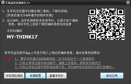 启动考试客户端后,页面上会出现要求启动手机监控的弹窗,使用安卓手机扫描二维码(微信或浏览器扫一扫),安装手机监控APP(注意:手机与电脑必须在同一个WIFI网络,家里没有路由器时也可以用手机热点,但必须保证足够带宽),启动APP后,保持手机充电状态,并与电脑在同一局域网下,在APP上会出现电脑名称,点击名称,电脑上即出现手机拍摄图像。