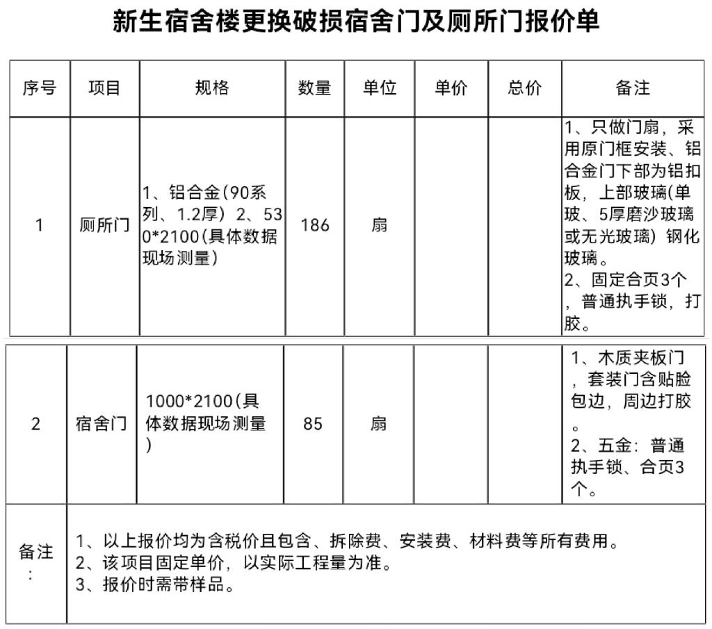我方拟采取公开招标谈判形式,对学院新生宿舍更换厕所门及宿舍门项目遴选施工单位,欢迎符合资格条件的施工单位前来参加。现将有关事项说明如下: