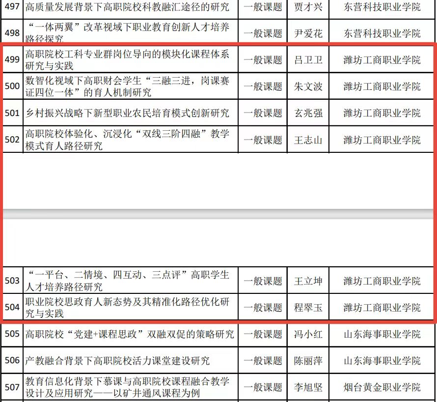 近日,山东省教育科学研究院发布《2023年度山东省教育教学研究课题拟立项名单公示》公告,经专家评审,并报评审委员会批准,我校6项一般课题进入公示名单,分别是吕卫卫牵头的《高职院校工科专业群岗位导向的模块化课程体系研究与实践》、朱文波牵头的《数智化视域下高职财会学生“三融三进,岗课赛证四位一体”的育人机制研究》、玄兆强牵头的《乡村振兴战略下新型职业农民培育模式创新研究》、王志山牵头的《高职院校体验化、沉浸化“双线三阶四融”教学模式育人路径研究》、王立坤牵头的《“一平台、二情境、四互动、三点评”高职学生人才培养路径研究》、程翠玉牵头的《职业院校思政育人新态势及其精准化路径优化研究与实践》。