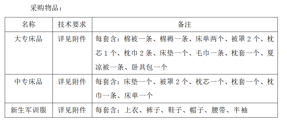 我单位拟采取公开招标方式,采购床上用品及军训服。