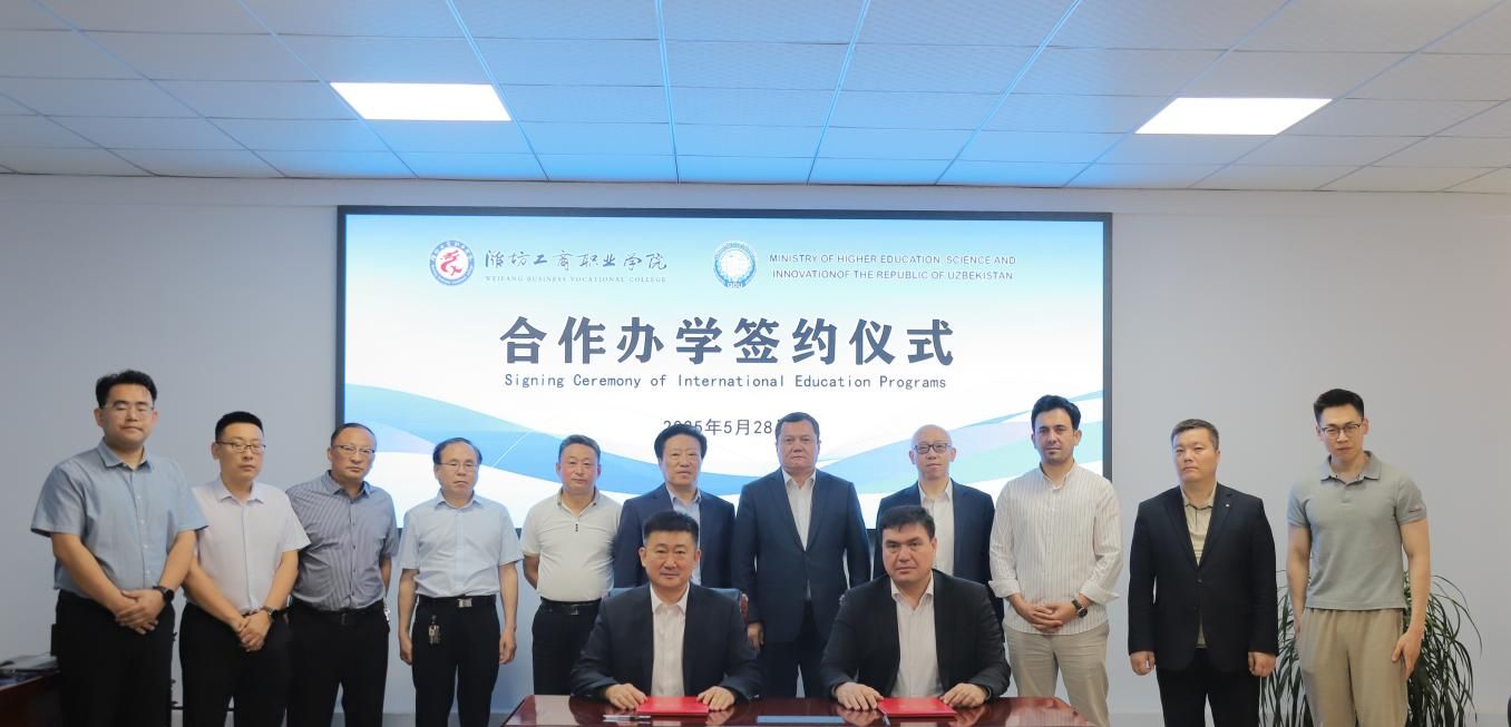 5 月 28日,乌兹别克斯坦卡拉卡尔帕克斯坦共和国投资、工业和贸易部副部长乌斯马诺夫·乌马尔·库特利穆拉托维奇率代表团到访我校,就国际化合作办学展开深入交流。潍坊市产教融合研究院副院长马玉才、中亚教育交流研究发展中心副主任王晓文陪同来访,校长张绍秋,党委常务副书记、执行校长郑志松,副校长、潍坊市经济学校校长唐德良及合作办学处处长侯国强等相关负责同志热情接待,双方围绕产业发展、职业教育合作等达成多项共识,并签署战略合作协议。