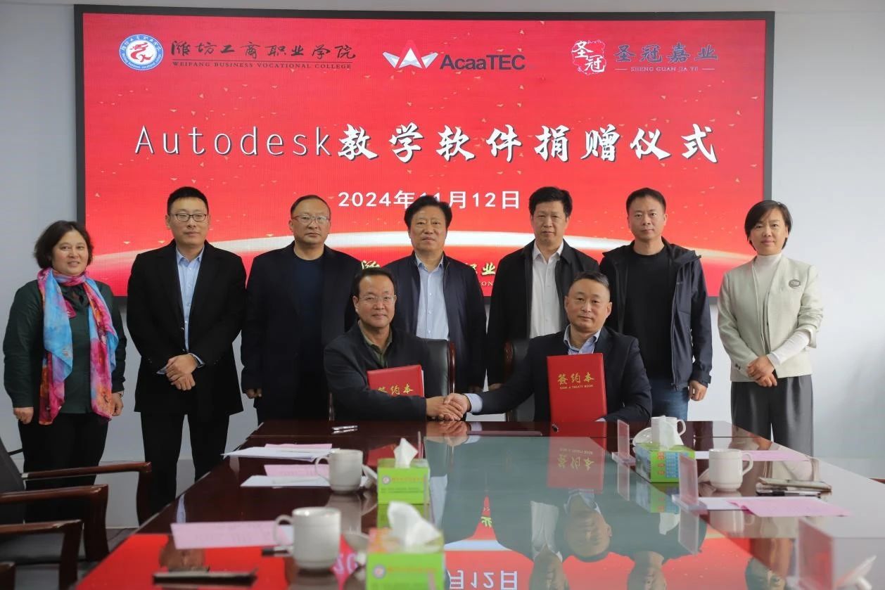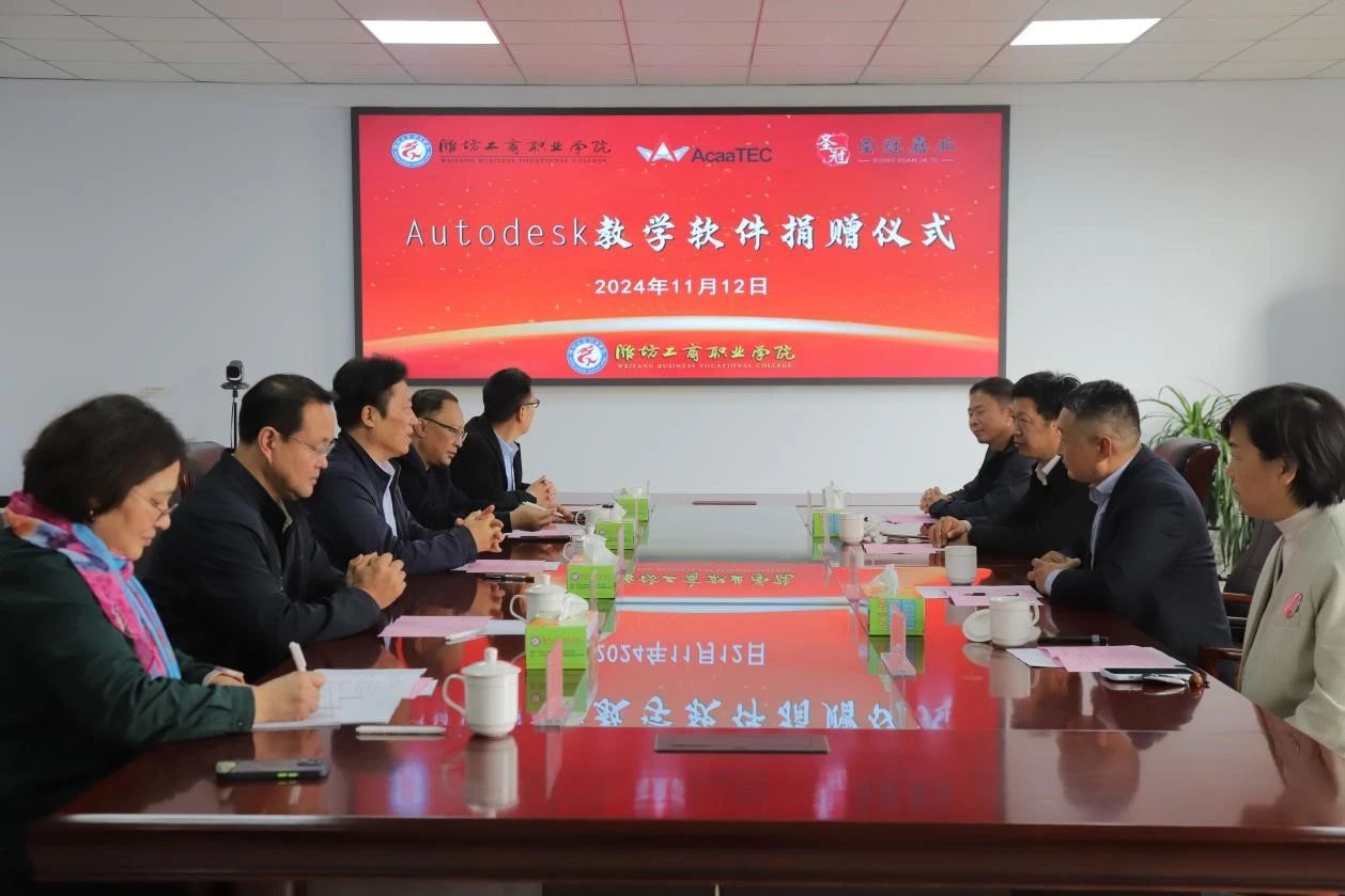 11月12日上午,Autodesk中国教育管理中心(北京泰科携同教育科技有限公司)、圣冠嘉业(北京)科技有限公司向潍坊工商职业学院联合捐赠软件仪式在图书楼516会议室举行。潍坊市产教融合研究院院长冯秀红,圣冠嘉业(北京)科技有限公司董事长,中国职业技术教育学会原国际部副主任王晓文,欧特克公司中国教育中心副总经理张永军,潍坊云汇智能科技有限公司董事长马荣静,我校校长张绍秋,副校长、经济学校校长唐德良,副校长郑明言,合作办学处处长侯国强等出席捐赠仪式。