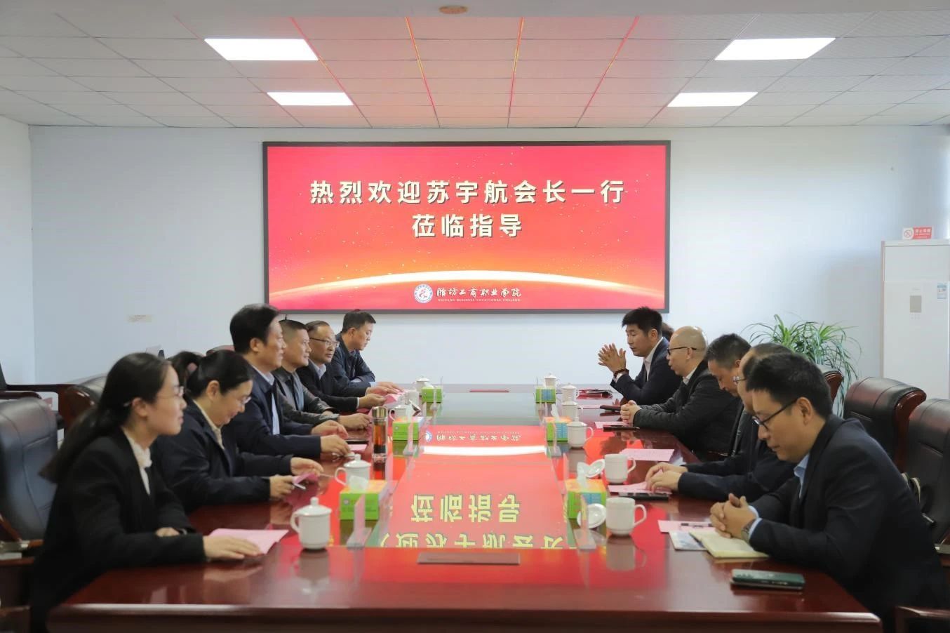 10 月 23日,阿曼中国和平统一促进会执行副会长苏宇航一行来到潍坊工商职业学院进行交流访问,此次交流围绕职业教育出海发展这一中心思想展开。中国职业技术教育学会原国际交流部副主任、全国高职高专招生就业协作会副秘书长王晓文,潍坊市产教融合研究院副院长马玉才、诸城市委统战部分管日常工作的副部长管延沛,副部长王霞,我校校长张绍秋、副校长唐德良、合作办学处处长侯国强等陪同参加。