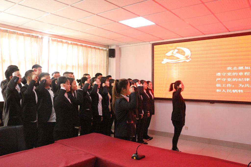 宣誓仪式在庄严的《国际歌》声中开始,杨晓洁同志领读誓词,董浩、刘雅文、马晓霞、杨倩倩、程月娇、丁捷、葛梅杰、姚震、常春凤、张凡清、姜南、伊兴虎、韩春苗、李潇雨、李敏、毕鑫家、桑克利、王燕、张育硕、赵珊珊、李建林、王鹏程、王欣蕊、程湘凯、丁毅超、朱佰艳、张粉等27名新入党同志面对党旗,庄严宣誓。