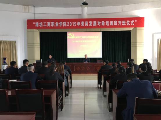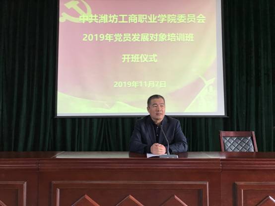 潍坊工商职业学院2019年党员发展对象培训班开班仪式于11月7日下午在学院第二报告厅举行。党群工作部部长王峻主持,党委副书记、副院长刘国庆出席并作重要讲话。