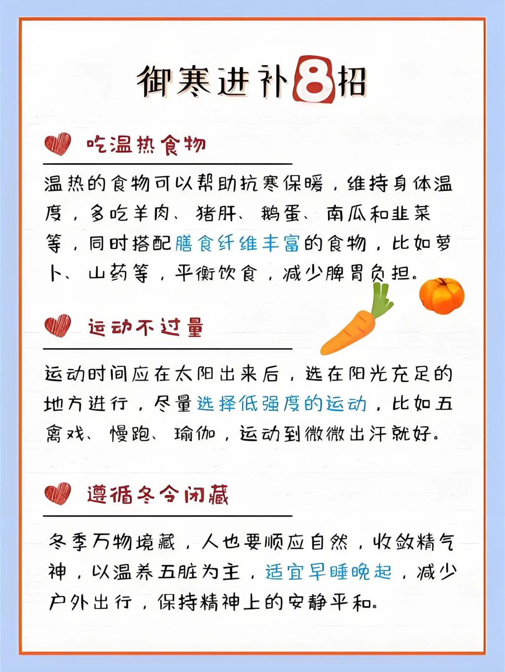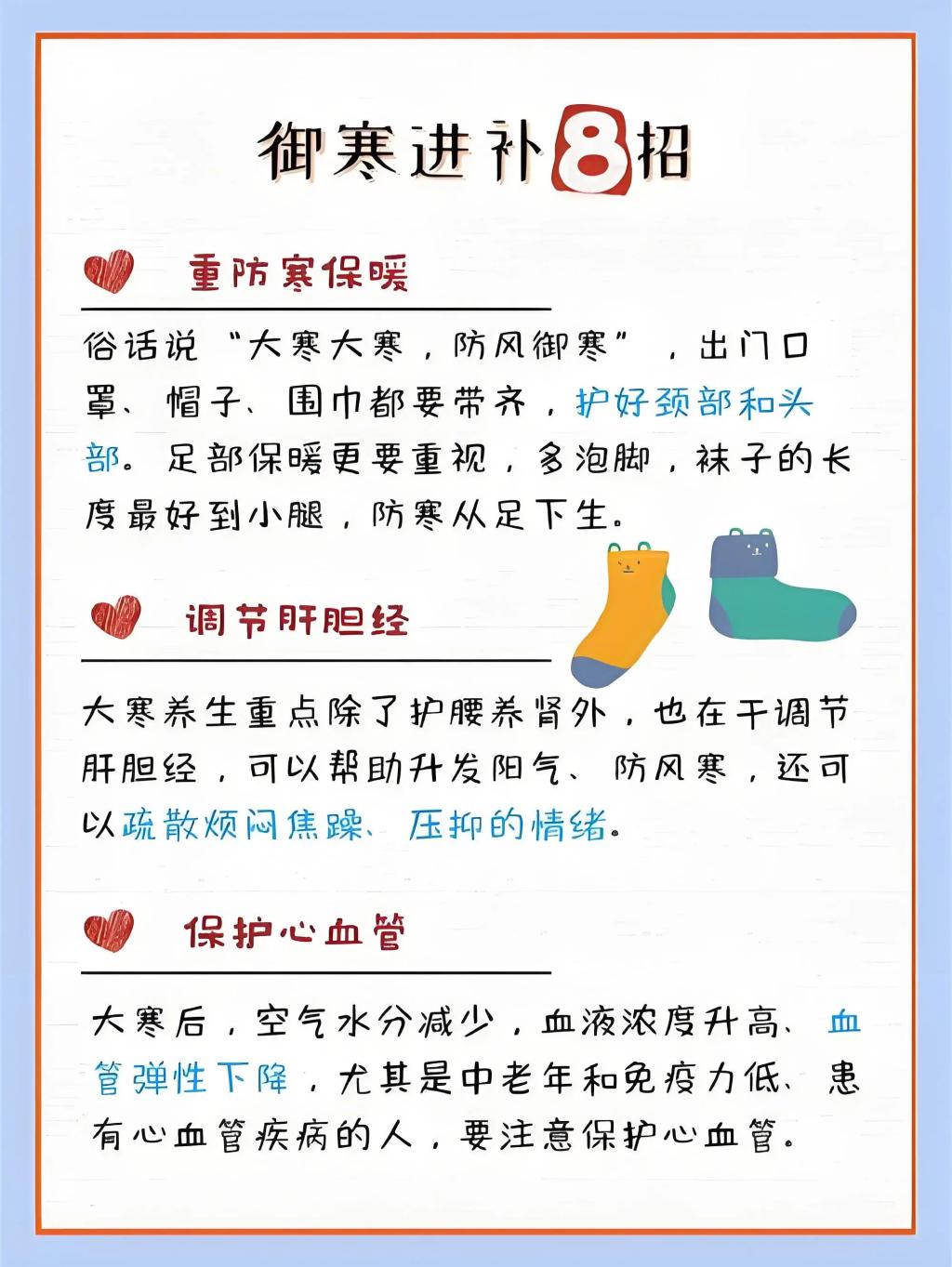 我们要保暖防寒,大寒时节,气温低下,人体容易受到寒冷的侵袭。还要饮食的调养,大寒时节,我们要注意饮食养,多吃一些温补的食物。最好还要适度运动,可以增强身体抵抗力,预防疾病。当然最重要的是规律作息,在大寒时节,我们要保持规律的作息,早睡晚起,避免熬夜,以保持身体和精神的健康。还要保持愉快的心情哟。