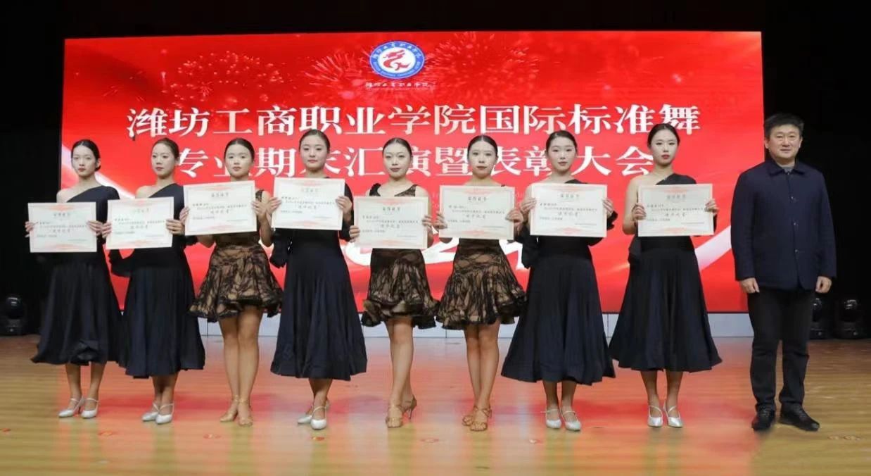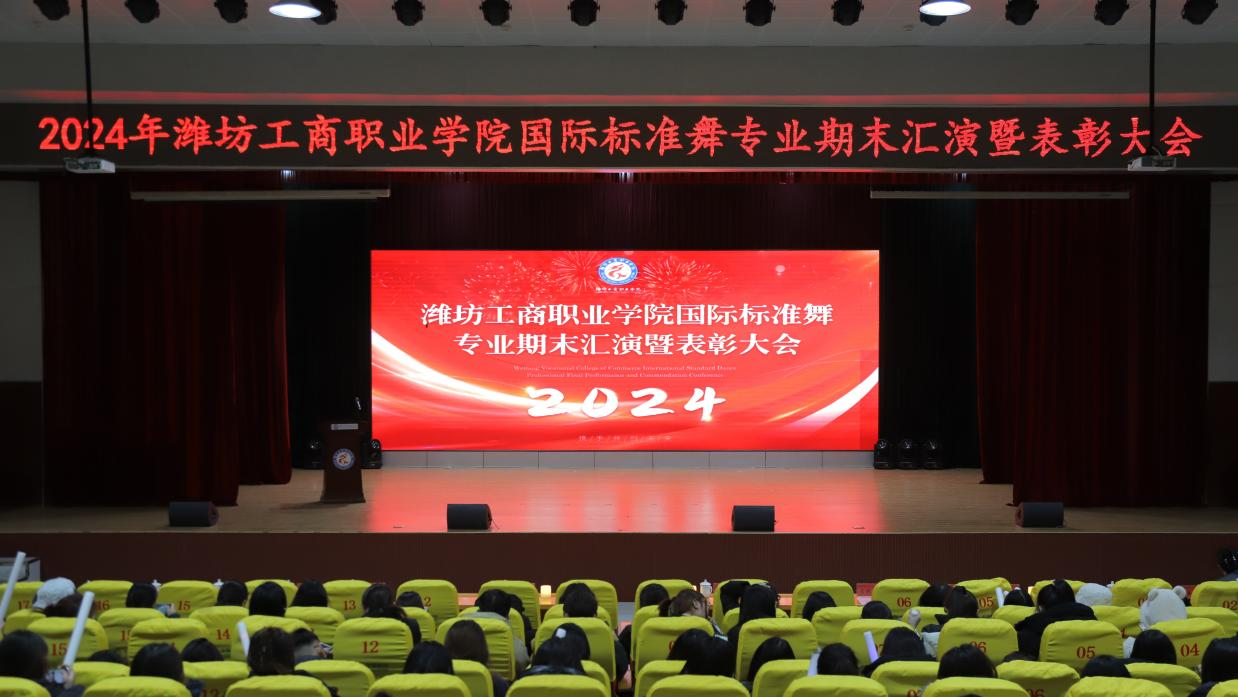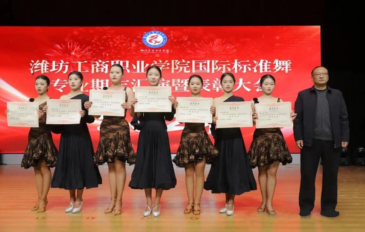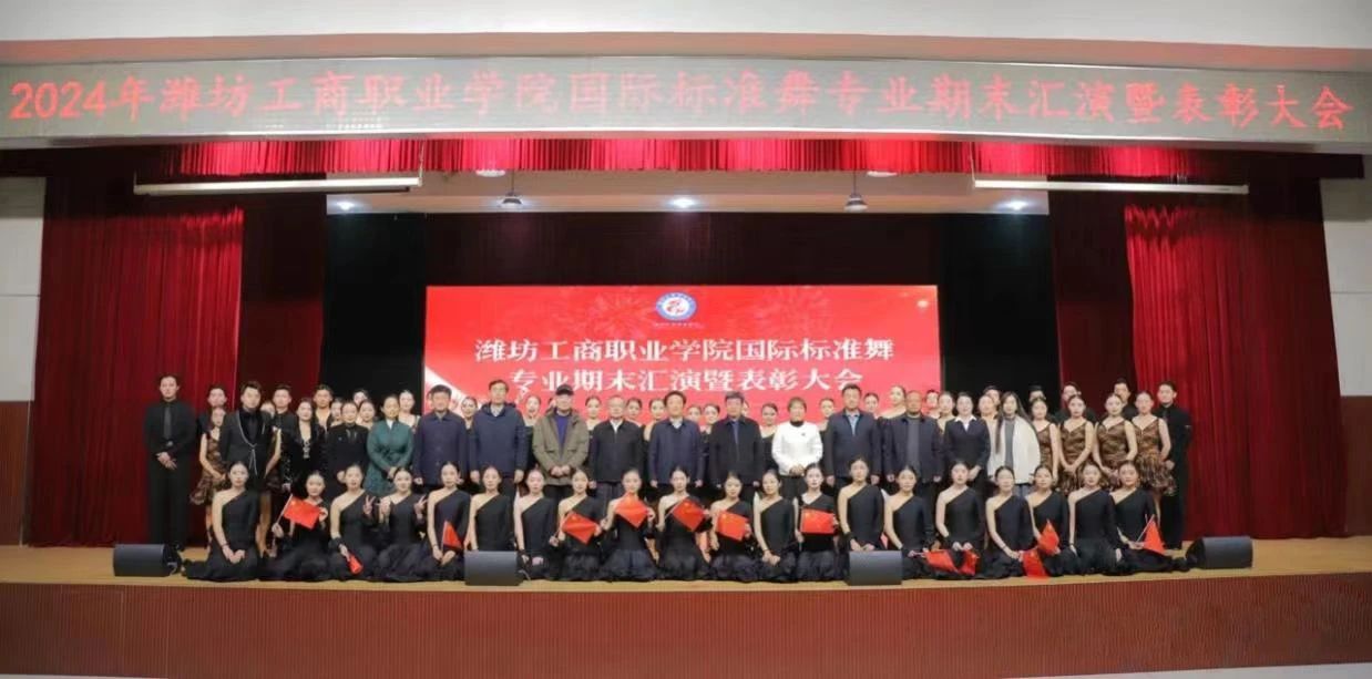 2024年12月30日,潍坊工商职业学院幼教艺术学院国际标准舞专业期末汇演暨表彰大会在第一报告厅举行。诸城市政协党组成员管常青,市委宣传部调研员王晓华,文旅局党组书记、局长李彦玲,体育事业发展中心党组书记曲波,校长张绍秋,执行校长、党委常务副书记郑志松,副校长唐德良等领导嘉宾出席;活动由专业负责人陈瀚主持,幼教艺术学院院长冯玉香致欢迎词。