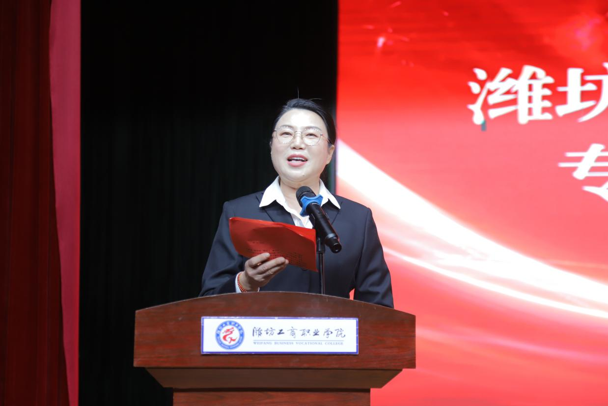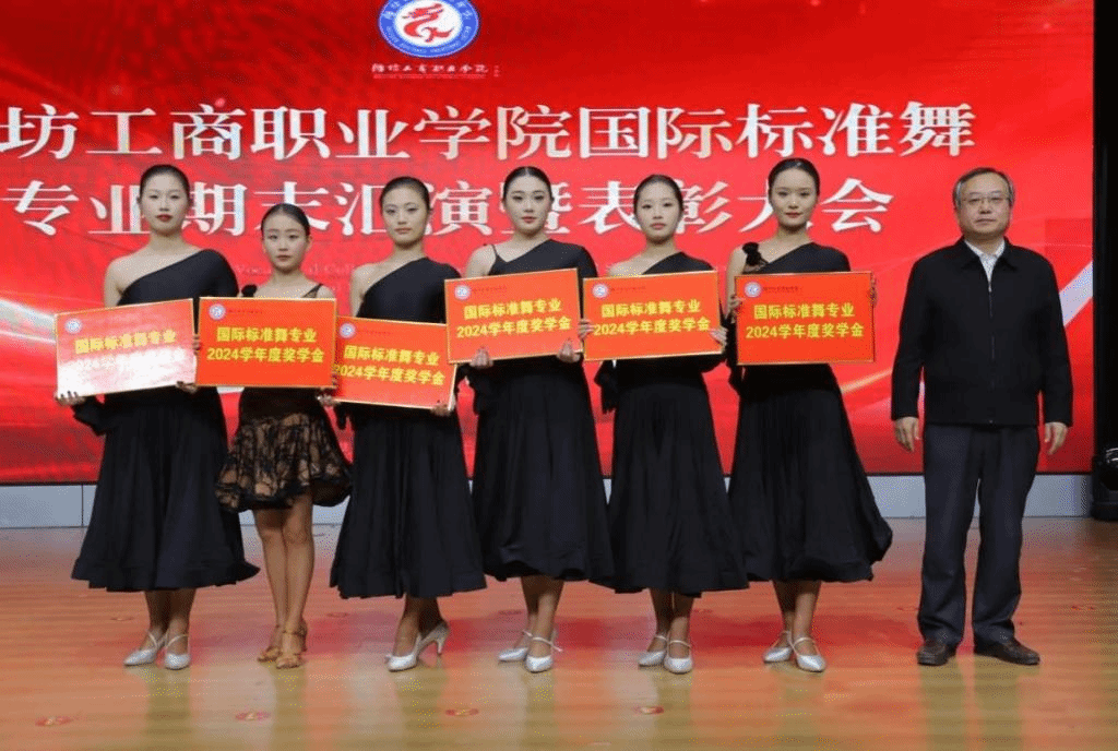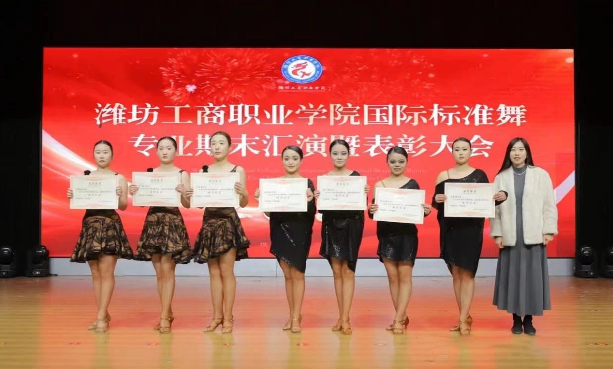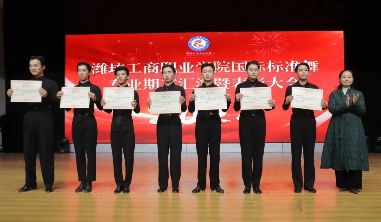 2024年12月30日,潍坊工商职业学院幼教艺术学院国际标准舞专业期末汇演暨表彰大会在第一报告厅举行。诸城市政协党组成员管常青,市委宣传部调研员王晓华,文旅局党组书记、局长李彦玲,体育事业发展中心党组书记曲波,校长张绍秋,执行校长、党委常务副书记郑志松,副校长唐德良等领导嘉宾出席;活动由专业负责人陈瀚主持,幼教艺术学院院长冯玉香致欢迎词。