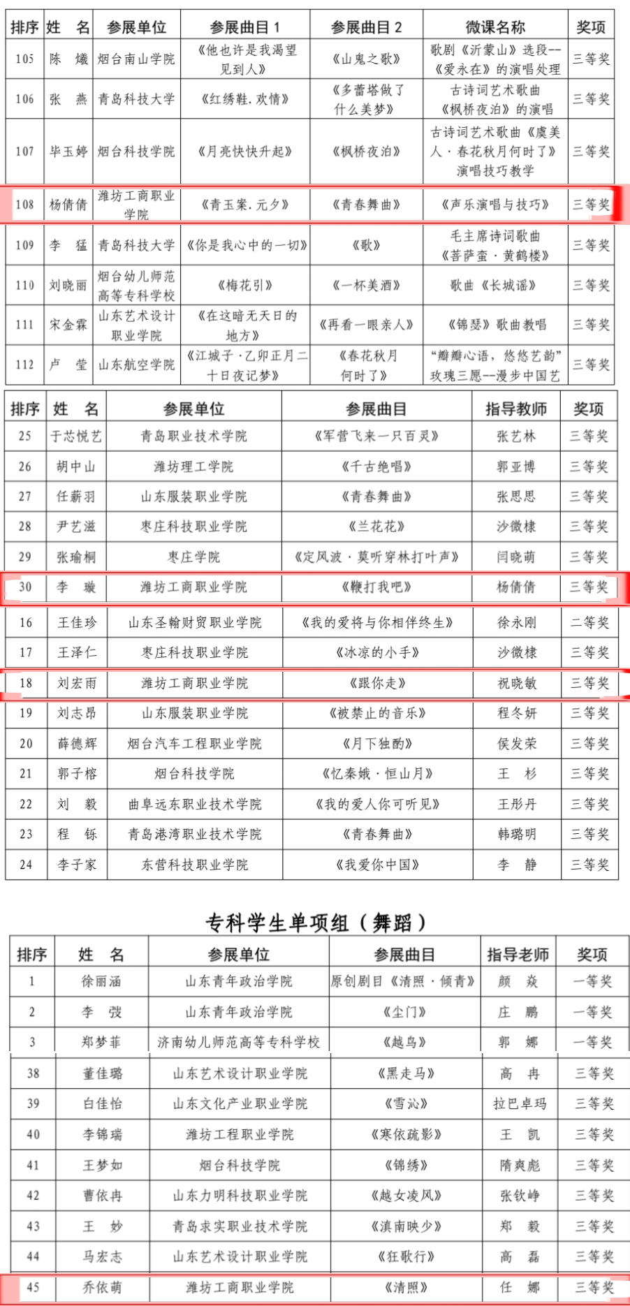 在第十七届山东省职业院校技能大赛中,幼教艺术学院崔维甜老师在幼儿教育技能赛项教师个人赛中荣获二等奖,位列36个参赛队中的第6名。学生团体技能赛中,由祝晓敏、葛秀萍、孙淑蕾老师指导的团队(学生:李大川、权威、陈彦琪)在“声乐、器乐表演”赛项中获得省赛二等奖,实现了新的突破。