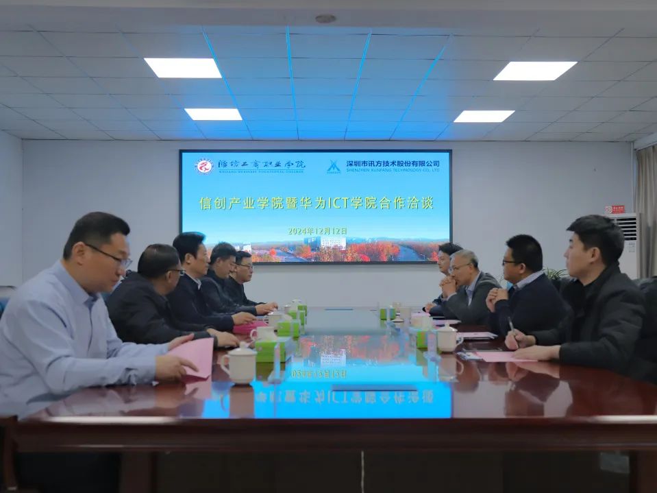 12月12日,深圳市讯方技术股份有限公司总裁刘国锋、北方大区总经理杜红奎等一行到我校交流访问,共同探讨信创产业学院暨华为ICT学院建设事宜。校长张绍秋,执行校长、党委常务副书记郑志松,副校长、经济学校校长唐德良,合作办学处处长侯国强,智能信息学院院长孙炳江陪同参观并出席座谈会。