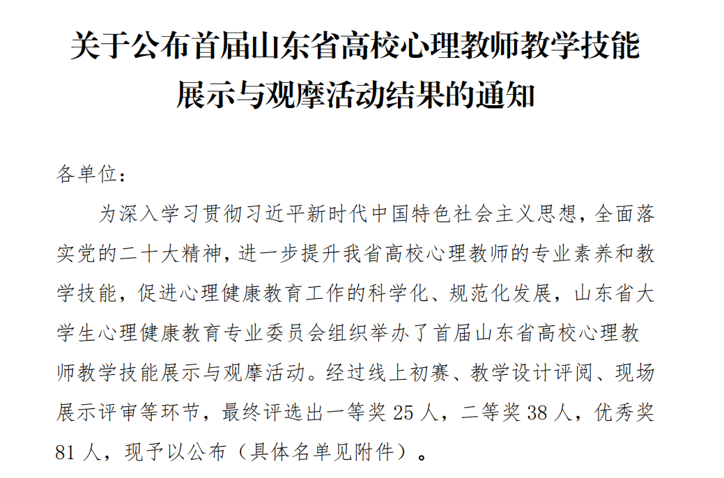 近日,首届山东省高校心理教师教学技能展示与观摩活动结果揭晓,我校教师郝传慧荣获二等奖,宋杰获优秀奖。